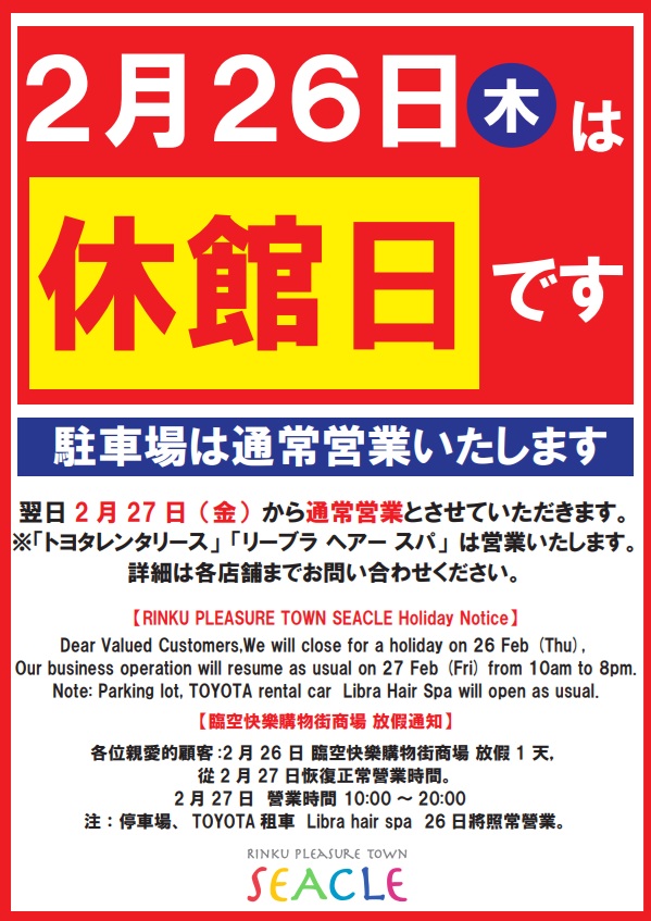 2/26(木)は施設休館日の為